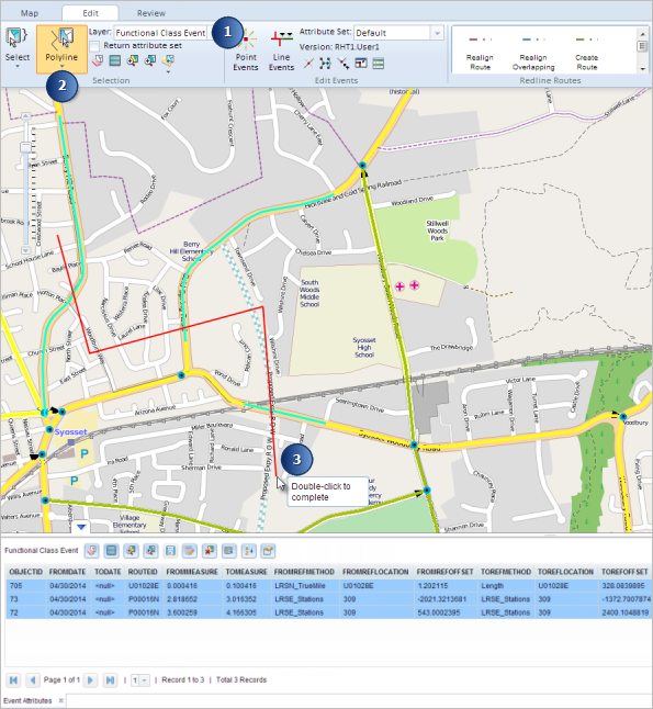 The events, routes, or point features intersecting the polyline will be highlighted on the map, and the records will be shown in the form of a table.